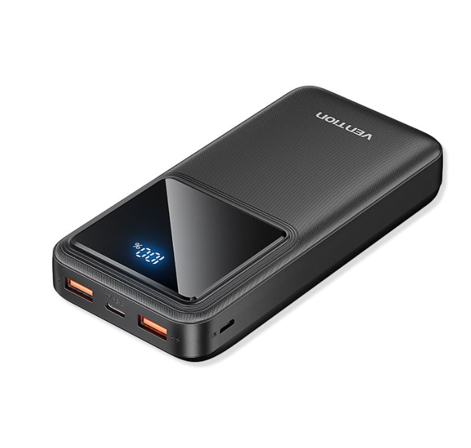 Vention 20000mAh Power Bank (Micro-USB + USB-C + USB-A + USB-A) 22.5W Black LED Display Type is A high-capacity portable charger that keeps your devices powered all day. It features a 20000 mAh cell, fast charging support, an LED power indicator, and flexible input/output options.