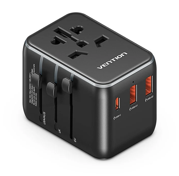 Vention 3-Port USB (C+A+A) Universal Travel Adapter(20W/18W/18W)Black is A travel adapter that delivers fast charging for multiple devices in a compact design. It works worldwide without needing configuration.